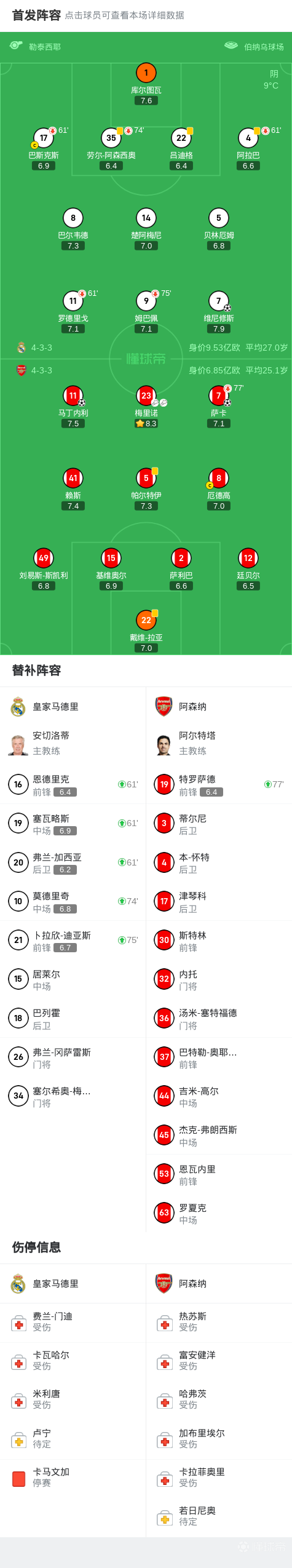上半场比赛开始,姆巴佩在第13分钟取得了一粒进球,然而VAR判定其越位在先,进球被吹罚无效。随后,萨卡多次威胁皇马球门,但都未能破门得分。在比赛进行到第65分钟时,梅里诺的精准传球找到了萨卡,后者冷静挑射破门,将比分改写为4-0,为阿森纳奠定胜局。